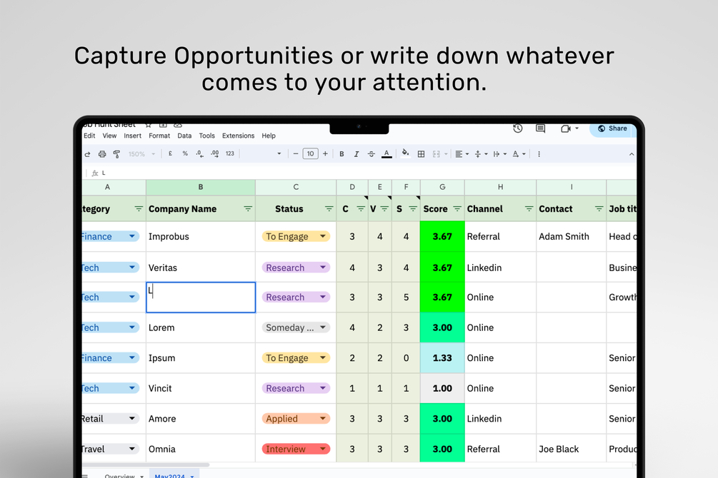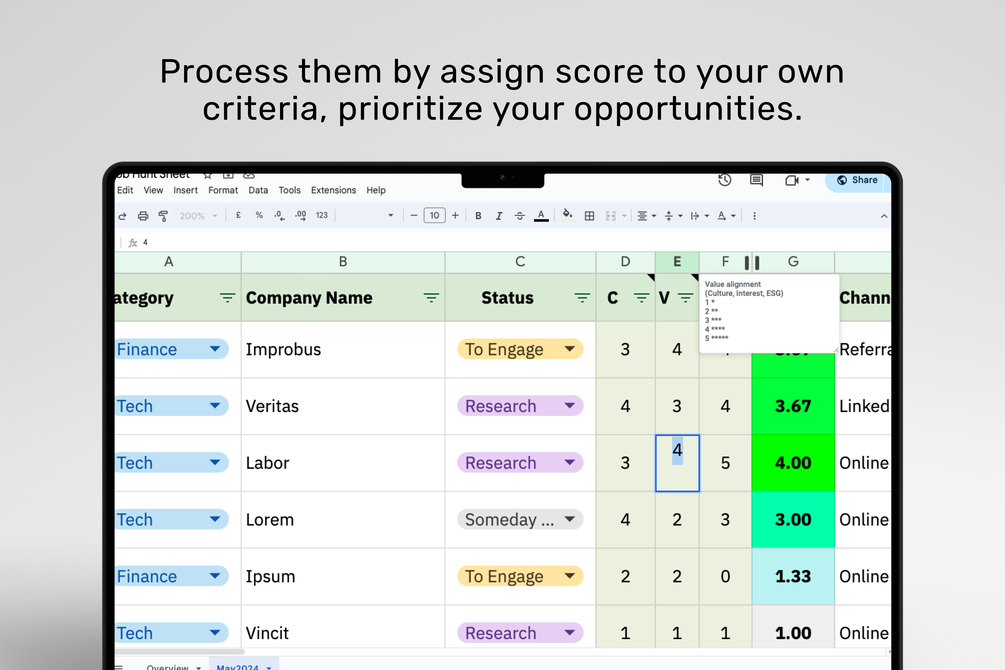 Job Hunt Sheet for Google Sheet with my own personal framework to make sense of this journey.